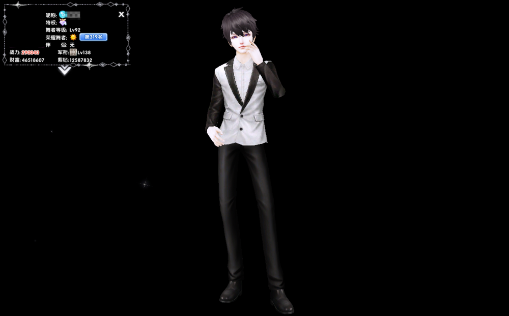 9000出巨星带专钻14消费12.5W+财富4649W3黑净光双修恶魔头白框一指流烟男号双黑昵称黑夜名片白西装婚纱绅士龙凤樱唇上衣龙凤套冷目朦胧衷情冷意落寞水漾执迷人鱼忧冷成熟等10页脸单人套8页伴侣套5页动作对接12页白框眼镜920戒指4页外搭3页动作名片腿套齐全美妆齐全有咖皮,编号10382